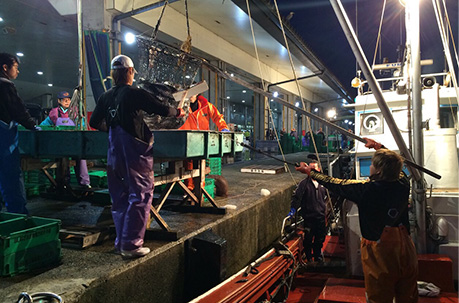 萩大島船団丸が漁に出るのは、午後遅く。沖合に出て漁場に着くと、船に灯をともして魚を集めます。そうして日が暮れるのを待ち、夜になると巨大な巻き網を海に投入。網が上がると獲れた魚を写真に撮り、LINEを使ってリアルタイムで情報を発信します。顧客から注文を受けるとすぐに、生きたまま船上で血抜き。帰港してから早朝に箱詰め作業を行い、「鮮魚BOX」として、その朝のうちに出荷されます。