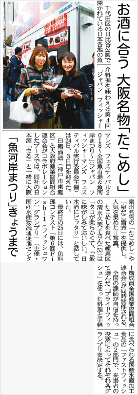 2018年11月22日(木)~25日(日)の期間、白鶴酒造は大阪府漁業協同組合連合会とともに「第4回 ジャパン フィッシャーマンズ フェスティバル 2018 〜全国魚市場&魚河岸まつり〜」にブース出店をいたしました。